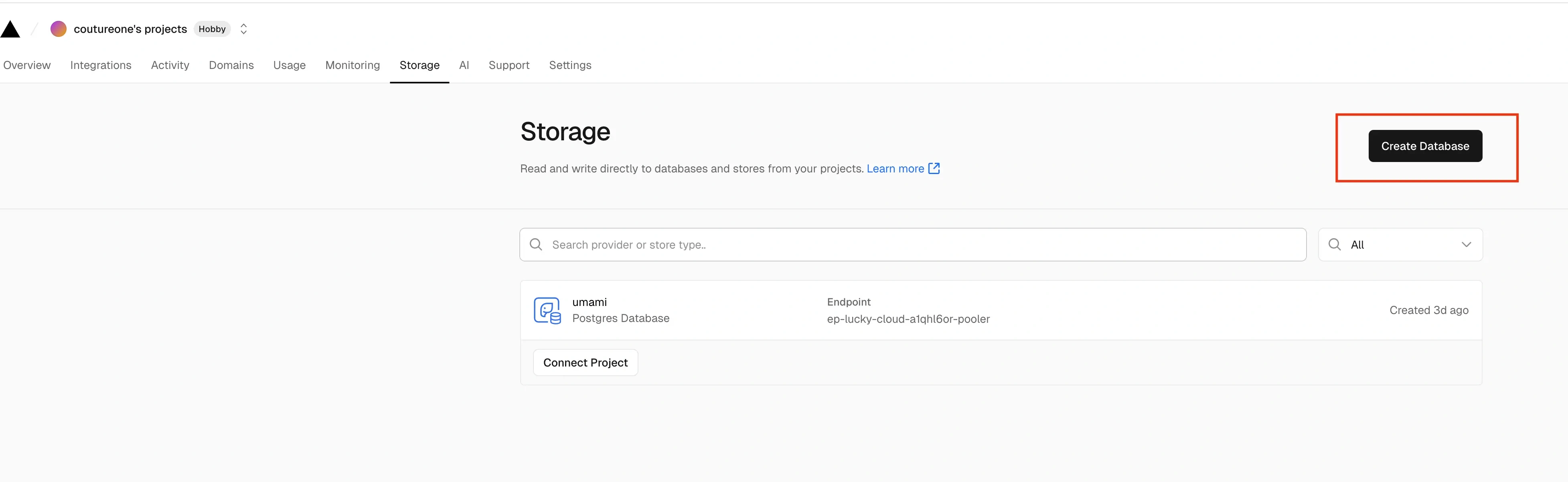 2.3 在创建好数据库以后,回到主页面的Overview,然后右上角有一个Add New选择添加Project,选择你Fork的umami,添加即可。
