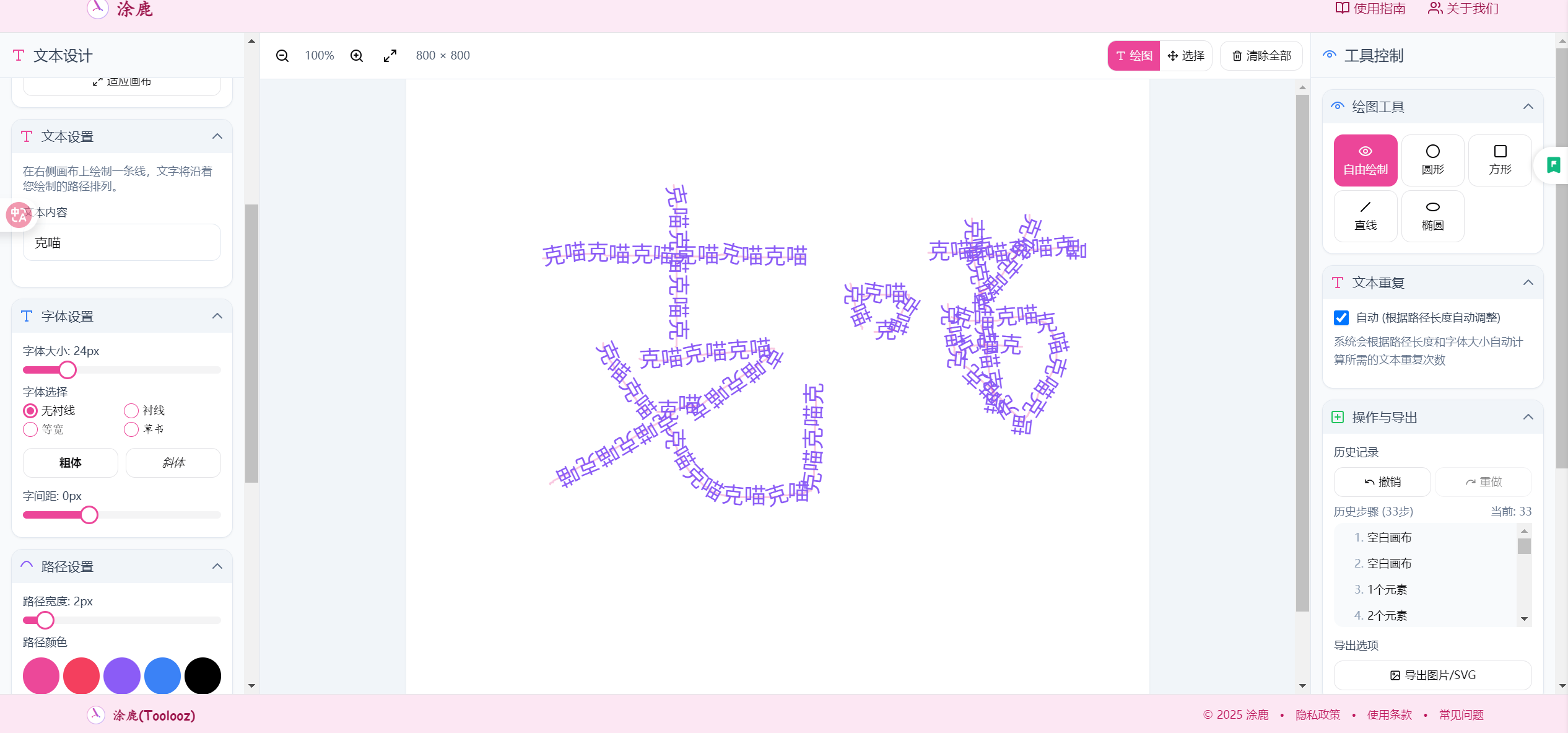 支持自定义画布尺寸、文本内容、字体、间距、颜色、描边等,还支持多个绘图工具和选择文本是否重复,可导出为 PNG、WebP 和 SVG 格式,免费使用,无需注册。